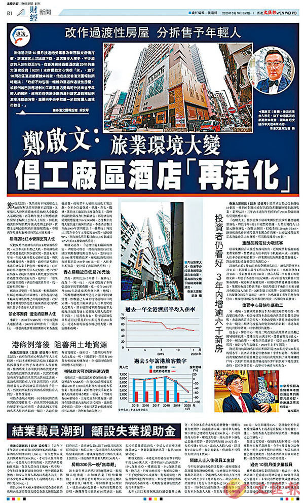 今年3月香港文匯報(圖)記者獨家訪問鄭啟文,談及到本港遭受黑暴及新冠肺炎疫情雙重打擊,本港旅業環境大變 ,鄭啟文當時就提出建議,由政府徵用酒店作檢疫隔離中心,他更表示自己並不介意將旗下酒店用作檢疫隔離中心,這項建議政府已在實施中。他另提出將工廠區酒店「再活化」。