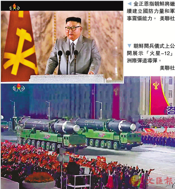 朝鮮於昨日凌晨零時開始,在平壤金日成廣場舉行閱兵儀式,慶祝執政勞動黨建黨75周年。閱兵儀式公開展示洲際彈道導彈,是自從朝鮮和美國前年在新加坡舉行峰會後的首次,部分更是從未亮相的新型導彈,而韓聯社報道,朝鮮還展示新型「北極星4」型潛射彈道導彈。領導人金正恩在儀式上發表講話,稱對於沒有國民感染新冠肺炎感到欣慰,希望在韓國的同胞能克服壎穻M機,與朝方堅定攜手合作。
