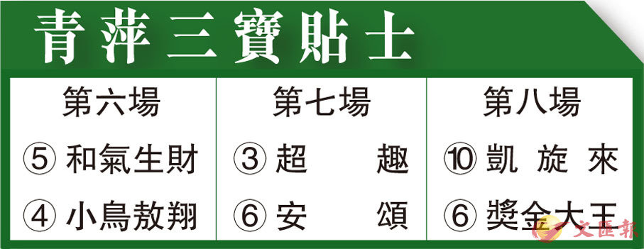 第六場、第三班、一○○○米。「和氣生財」上季魒旬韝峊觓韝@千米三度跑入第三,於三月一日落第後提早W暑,練馬師於五月將牠送往從化休息,在八月初回港操練,早前在潘頓胯下試泥閘,輕鬆大勝對手,進幅驚人,今晚復出跑窄場一千,回配潘頓操刀人馬合拍,可作馬膽敲之。