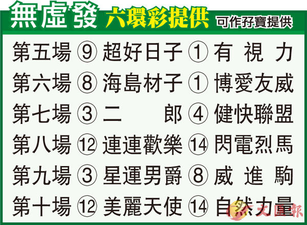 第六場「海島材子」上場波健士操刀一擊即中,按目前進度料四班難留,添食可期。「博愛友威」上季贏馬一役締速及姿態無花無假,今季轉馬房後更加惹人憧憬,居四班作賽贏盡班底,以沈廄作風肯定會搏盡求省靚招牌。