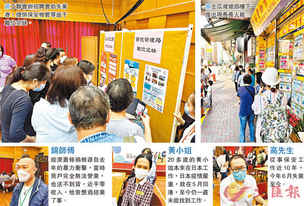 去年的黑暴加上今年疫情令香港遭受前所未有的經濟打擊,不少打工仔頓失飯碗,最新失業率徘徊在6.4%高位,25萬人失業,工聯會發起「救失業度時艱」關愛行動,九龍區招聘會昨日率先在土瓜灣工人俱樂部總部9樓舉行,提供逾1,000個職位空缺,總部樓下一度出現長長人龍。不少應徵者表示搵工難,有精通英日語的研究生過去半年只求一份萬餘元工資的文職工作,卻一直無虒芋C有到場請人的僱主則直言,今日的經濟蕭條,禍根源自去年的暴力衝擊,幸有政府的援助計劃渡難關。■香港文匯報記者 文森