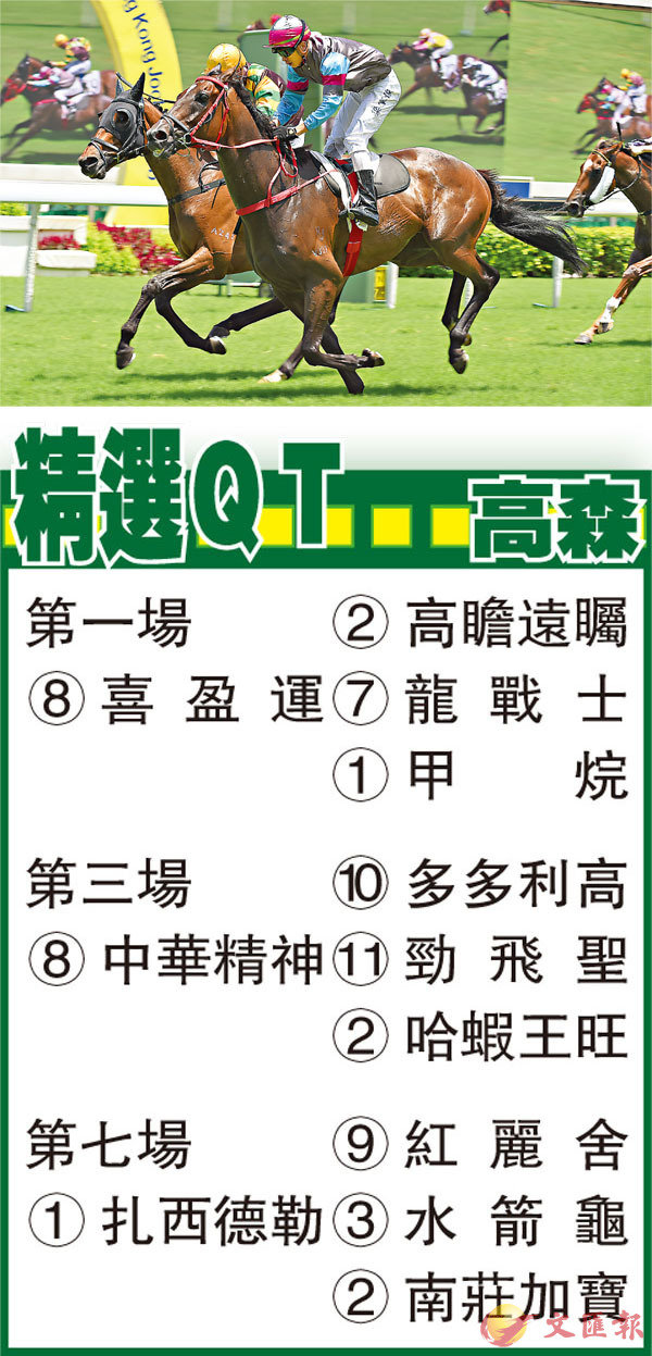 第一場、第四班、二二○○米。「喜盈運」(圖灰色綵衣)上賽評分處低位終作出反彈,負一二八磅爭同程,跟守前列好位,末段殺上取得寶貴的勝利;現升上四班改負輕磅競爭力不減,繼續留神。「龍戰士」剛役攀上田草二千米排八檔,沿途留在馬群後疊競跑,入直路重重圍困,最後二百餘米才能望空,結果追得季軍,如今次取位順利可更具威脅。