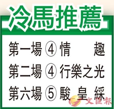 第六場、第三班、一○○○米。開季至今有唔少七歲或以上鵀扆迅茈X,好似「英明勇將」、「蒙古王」及「線路光輝」等,今期有匹七歲馬「駿皇綵」,大摩退休後,馬主譚少強仍肯保留佢,並與同主「駿皇星」一併轉至文家良馬房,應仲有後荂C「駿皇綵」今季初出田草直路賽,S形走位衝入第四,發揮好少少隨時有位置,難得幕後繼續俾機會梁家俊,目前評七十五分重返上次贏馬時水位有利,騎者肯定搏盡報答支持。