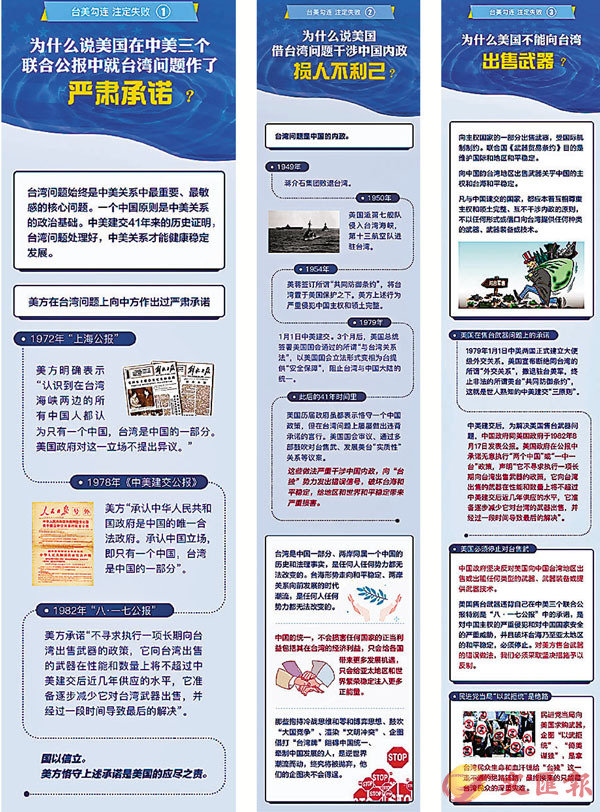 香港文匯報訊(記者 朱燁 北京報道)國台辦自9日起連續推出「台美勾連 注定失敗」系列圖文(見右圖),脈絡清晰地梳理回應了「三個聯合公報的嚴肅承諾」、「美國干涉中國內政損人不利己」、「美國不能向台灣出售武器」等問題。國台辦在圖文詳解中表示,台灣問題始終是中美關係中最重要、最敏感的核心問題。「一個中國原則是中美關係的政治基礎。中美建交41年來的歷史證明,台灣問題處理好,中美關係才能健康穩定發展。」