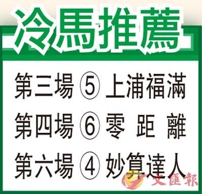 第三場、第五班、一八○○米。「上浦福滿」屬泥地好手,前季一口氣於泥地中長途打疊贏三場升上三班,結果因為搏得太多出現疲態,加上評分高企,令到上季一整季毫無表現,陣上演出令人失望,此暑期加盟高伯新馬房,前仗復出跑谷草一哩依然取得殿軍,反映馬兒已有起色,上仗泥地抽十四檔,跑到拉士才力弱,今次重返谷草上陣有權擊敗對手,最佳冷品。