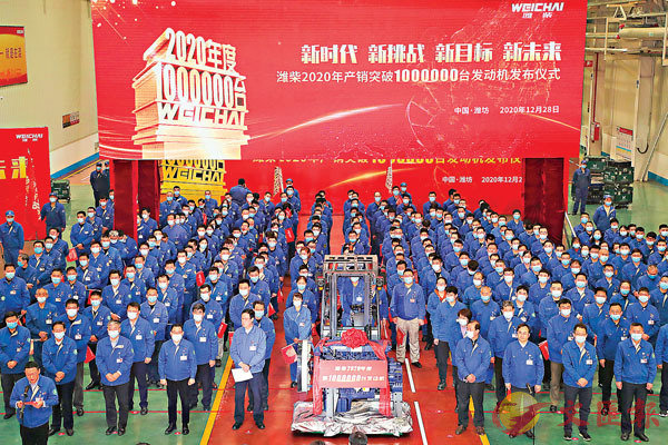 12月28日,濰柴動力(2338.HK)母公司濰柴集團宣布2020年產銷發動機突破100萬台,同比增長33%,發動機總銷量首次邁入全球第一,成為全球最大的柴油機產業集群。■香港文匯報記者 丁春麗