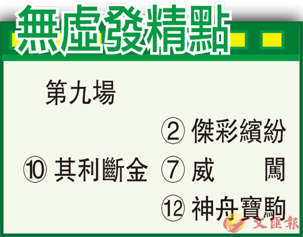 今日跑馬地馬場將會上演九場草地賽事,使用A跑道作賽,跑道全闊不移欄,闊三十點五米,直路長三百一十二米,為谷草多條跑道之中最短,今次是季內谷草第四次使用A跑道,上次使用是十二月二日,當日草地度地儀指數為2.71,場地掛牌為好地。當日八匹頭馬之中只有「艮志騰雲」一匹是排在外檔,其餘七匹均排中內檔起步,可見當日的A跑道大利中內檔馬。跑法方面,八匹頭馬之中只有「動力飛鷹」一匹是放頭,其餘七匹均使用後追或跟前跑法,當日的跑道不利放頭馬。今季在谷草A跑道贏馬最多的練馬師是方嘉柏、呂健威、沈集成及羅富全各贏了四場。騎師方面,今季在谷草A跑道贏馬最多的是何澤堯,贏了五場,之後是巴度贏四場。今次提供葉楚航馬房的「其利斷金」,歷來四戰谷草A跑道獲三場頭馬,勝出率達七十五巴仙,上賽首度增程千八米即勝,乘當起之銳有力再建奇功。