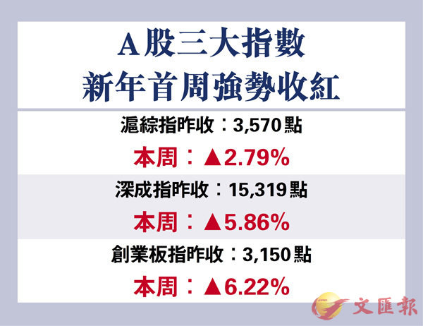 新年以來,A股表現驍勇,首周五個交易日,除昨日外其餘均收於紅盤。周內滬綜指累計升幅達2.79%,深成指周漲5.86%,創業板指周漲6.22%,三大指數都是連續四周上漲。