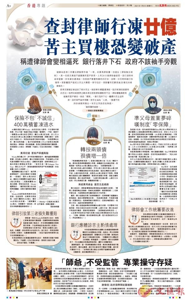 香港文匯報記者追訪了部分苦主,細訴畢生積蓄遭凍結,陷於經濟拮据窘局的苦況。他們的經歷更凸顯本港目前對律師樓監管不足,律師樓職員輕易能動用客戶資金,倘若「爆煲」,銀行落井下石,繼續向苦主追供款,政府部門袖手旁觀,使苦主淪為「人球」,慘遭不同持份者踢來踢去。有苦主哭訴走投無路,「真係隨時破產!」●香港文匯報專題組