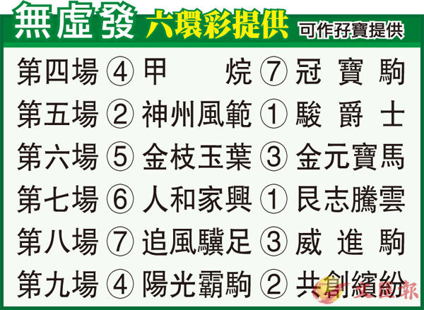 第五場「神州風範」過去數月輸六場火速降落四班,以上季尾六十八分跑第五名,如今四班谷草換鬙t一批對手,估計有力贏番場。「駿爵士」連續六場跑入前四名,上仗騎師賽用布達德得第四,今次北上從化贏好大閘再來可現真身。