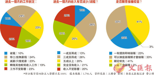 香港文匯報訊(記者 費小燁)新冠肺炎疫情對本港就業市場帶來莫大衝擊,工聯會最新一輪就業狀況調查發現,近80%受訪者的工作受影響,包括10%被裁、24%停工及放無薪假。即使保住「飯碗」,也絕大部分收入減少,另外21%更是「零收入」;另有47%受訪者對工作前景不樂觀。調查亦發現,大部分受訪者均願意接種疫苗,但不少人會等到「有得揀」疫苗時才去接種。工聯會促請特區政府即時推出失業/停工現金津貼,同時爭取已接種疫苗者通關時可免隔離。