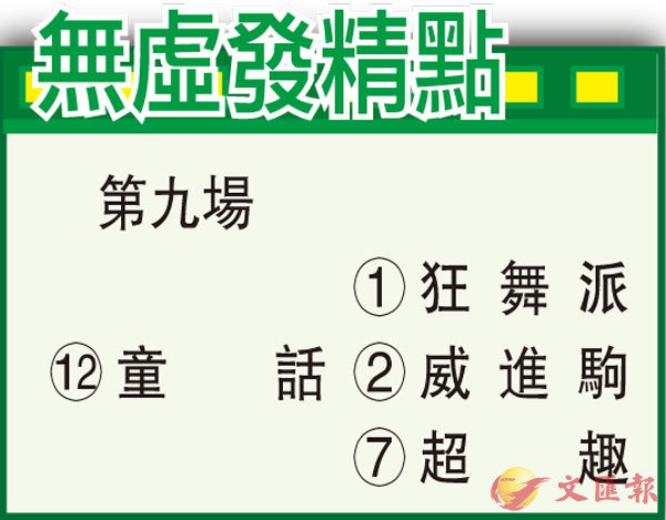 今晚跑馬地九場草地賽事使用C+3跑道,內欄向跑道中央移入十一米,闊十九點五米,為谷草多條跑道之中最窄,直路長三百三十五米,比A跑道長廿三米,今次是季內第五次使用C+3跑道,上次使用是十二月廿三日,當日草地度地儀指數為2.70,場地掛牌為好地,第六場開始改為好至快地。當日九匹頭馬之中只有「管得掂」、「勞動創造」及「加州得迅」三匹是排外檔,其餘六匹均排中內檔,當日的C+3跑道有利中內檔馬。跑法方面,九匹頭馬之中有兩匹放頭,七匹跟前,並沒有後追馬,當日的跑道不利後追馬。今季谷草C+3跑道贏馬最多的練馬師是方嘉柏,贏了七場,之後是文家良、呂健威、沈集成、韋達、霍利時與羅富全各贏三場。今季谷草C+3跑道贏馬最多的騎師是莫雷拉,贏了十一場,之後是潘頓贏六場。今次睇好徐雨石匹「童話」,歷來兩次渡江跑C+3跑道獲冠亞各一,今次又可威脅大局。