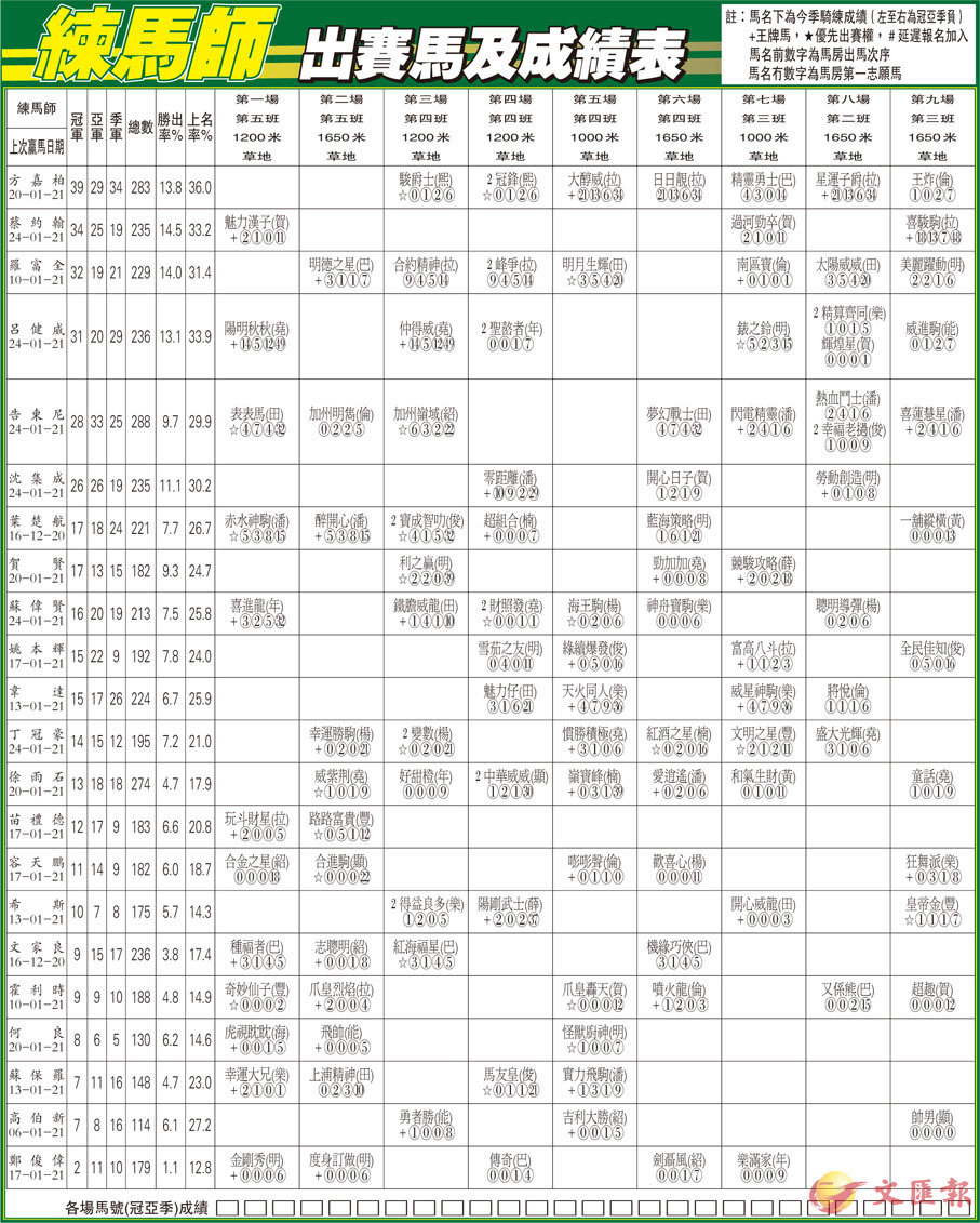 練馬師出賽馬及成績表
