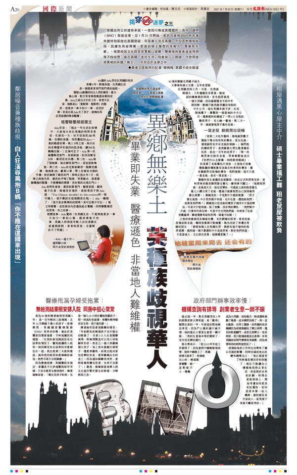 英國政府公然違背承諾,一意孤行推進英國國民(海外)護照(BNO)簽證政策,從1月31日開始,准許合資格BNO持有者申請特別簽證在英國居留。可是華人活在英國,不但面對種族歧視,因膚色而被辱罵,更遇到碩士學歷的年輕人「畢業即失業」、租屋時因文化語言差異難以維權、醫療服務質素遠遜預期等不快經歷。當在英國「美好生活」假象被一一戳破,才發現彼邦異鄉的所謂「樂土」,只存在於迷夢之中。