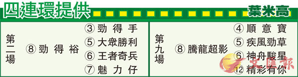 第二場、第四班、一二○○米。「勁得裕」父系「利確來」在澳洲服役時由希斯訓練,出賽十七次獲六冠一亞三季,勝出路程由一千至千四米,包括閃電錦標及星河大賽兩項一級賽。「利確來」退役後返回澳洲配種,超過二十匹子嗣勝出錦標賽,最出色為四項一級賽冠軍「綠化帶」。「勁得裕」周歲由文家良以十五萬澳元購入,母系曾勝出八場冠軍,包括表列賽及多次於相若級數賽事上名。產下數匹子嗣俱在澳洲出賽,主要在中短途賽表現較佳。既有父系「利確來」速度,母線亦擁全中短途美國血統,「勁得裕」短途實力值得高估。