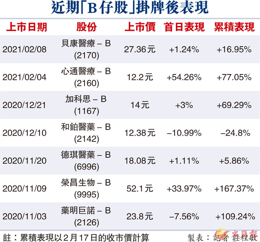 近期「B仔股」掛牌後表現