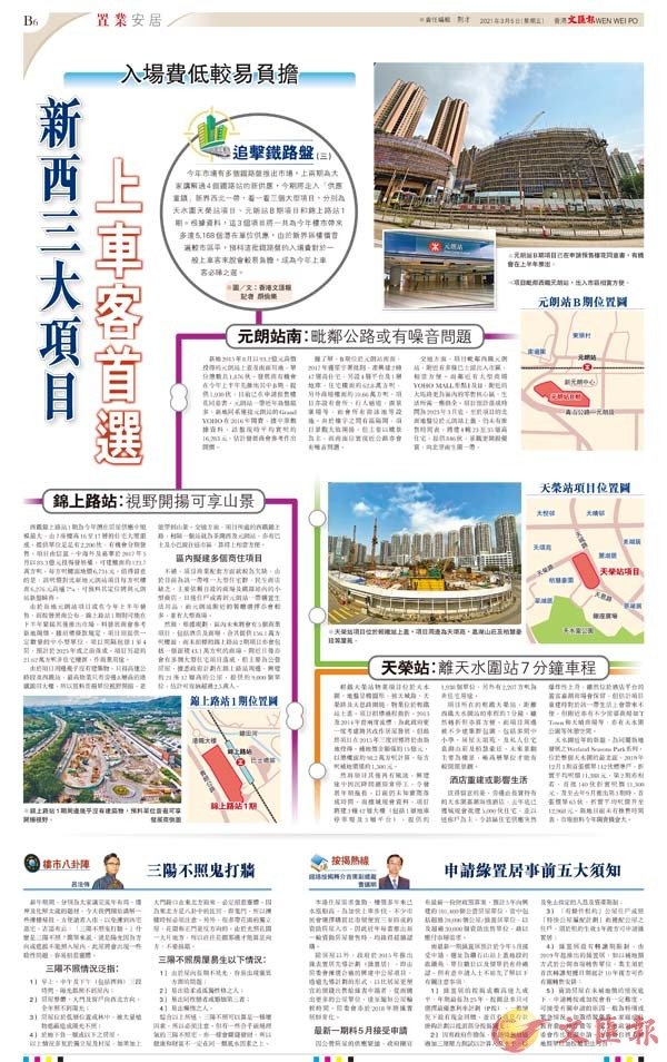 今年市場有多個鐵路盤推出市場,上兩期為大家講解過4個鐵路站的新供應,今期將走入「供應重鎮」新界西北一帶,看一看三個大型項目,分別為天水圍天榮站項目、元朗站B期項目和錦上路站1期。根據資料,這3個項目將一共為今年樓市帶來多達5,168個潛在單位供應,由於新界區樓價普遍較市區平,預料這批鐵路盤的入場費對於一般上車客來說會較易負擔,成為今年上車客必睇之選。●圖/文:香港文匯報記者 顏倫樂