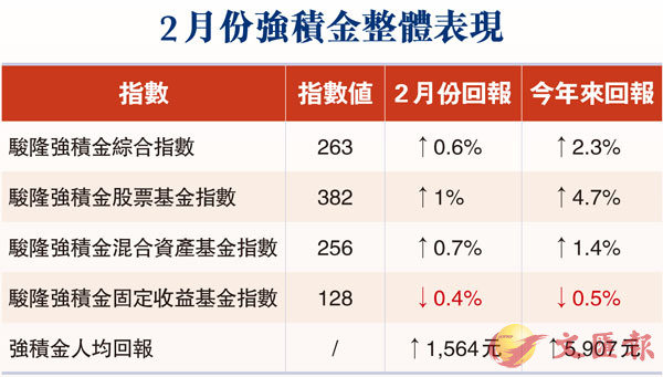 ªÑ¥«ªñ´Á¨ü¨ì¬ü¶Å®§¤W¤É¤ÞP¥«ªpªi°Ê¡A³Ì·s2¤ë¥÷ªº±j¿nª÷¡]MPF¡^¦^³øªí²{¤@¯ë¡CºI¦Ü2¤ë28¤é¡AÂ@¶©±j¿nª÷ºî¦X«ü¼Æ¤É2ÂI¡]+0.6%¡^¡A³ø263ÂI¡A¤ë¤º±j¿nª÷¨C¤H¥§¡¬Õ¾l1,564¤¸¡C¤T¤j¥Dn«ü¼Æ¦³¤£¦Pµ{«×ªºªí²{¡AªÑ²¼°òª÷«ü¼Æ¤É4ÂI¡]+1%¡^¡A³ø382ÂI¡F²V¦X¸ê²£°òª÷«ü¼Æ¤É2ÂI¡]+0.7%¡^¡A³ø256ÂI¡F©T©w¦¬¯q°òª÷«ü¼Æ·L¶^¡A³ø128ÂI¡C¡´»´ä¤å¶×³ø°OªÌ ½²Äv¤å