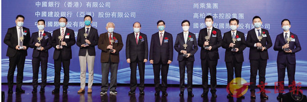 ●全國政協委員、香港廣東社團總會主席龔俊龍,全國政協經濟委員會副主任、友邦保險區域執行總監及榮譽顧問容永祺頒發粵港澳大灣區最佳金融服務大獎給獲獎公司代表