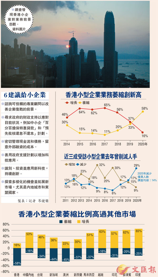 新冠肺炎疫情持續一年多,打擊環球經濟與企業商業信心。澳洲會計師公會昨發布2020/21年「亞太地區小型企業調查」顯示,香港小型企業商業信心跌至新低,只有16%受訪小型企業去年錄得增長,展望今年亦只有21%預計業務可以實現增長,為是次調查所覆蓋亞太地區11個市場中最低,相比之下本次調查的平均值為61%。報告形容,「香港小型企業是處於存亡邊緣」,並提出6條建議,提醒密切管理現金流和債務,以及應用新科技探索多樣化的機會並拓展新市場。●香港文匯報記者 岑健樂