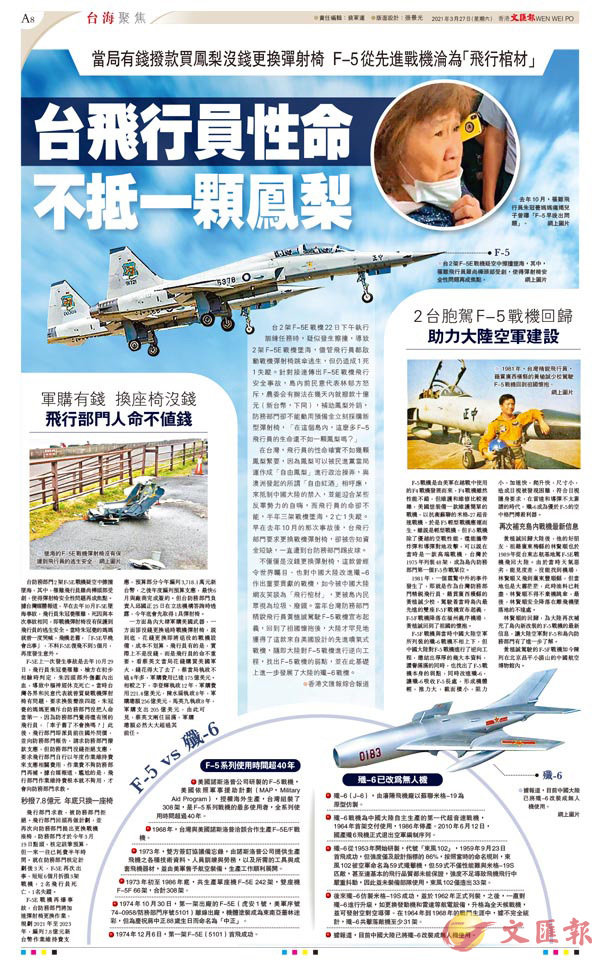 不僅僅是沒錢更換彈射椅,這款曾經令世界矚目、也對中國大陸改進殲-6作出重要貢獻的戰機,如今被中國大陸網友笑談為「飛行棺材」,更被島內民眾視為垃圾、廢鐵。當年台灣防務部門精銳飛行員黃植誠駕駛F-5戰機宣布起義,回到了祖國懷抱後,大陸才罕見地獲得了這款來自美國設計的先進噴氣式戰機,隨即大陸對F-5戰機進行逆向工程,找出F-5戰機的弱點,並在此基礎上進一步發展了大陸的殲-6戰機。