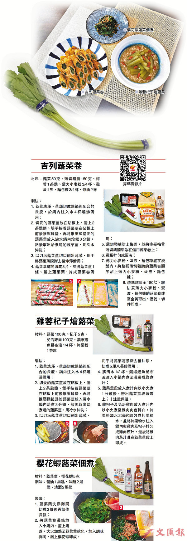 蕗菜又稱蜂斗菜、掌葉菜、老山芹、蛇頭草,其味辛、性溫,歸肺經,具有潤肺下氣、化痰止咳的功效,治咳逆喘息、喉痹等。蕗菜氣味雖溫,潤而不燥,則溫熱之邪,鬱於肺經而不得疏洩者,亦能治之,故外感內傷、寒熱虛實的咳嗽,皆可應用。所以,蕗菜有鎮咳下氣、潤肺祛痰的功能,能紓緩咳嗽、氣喘、肺痿、咳吐痰血等症,尤其是肺虛久咳不止,最為適用。現在,是蕗菜當造時期,這期間的蕗菜香氣特別濃厚,蕗菜莖部軟嫩,用鹽揉搓後焯水、撕去外層薄膜後可拌、炒、做湯等,而蕗菜葉的纖維豐富,吃起來有甘香的口感,今期以蕗菜為大家做出三款養生菜。