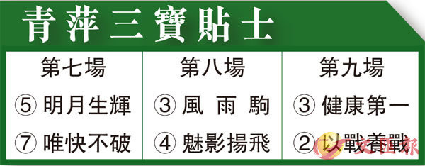 第七場、第四班、一○○○米。「明月生輝」在港三戰俱跑谷草一千,初出即與「實力飛駒」及「大醇威」纏鬥得第三;翌仗沿用田仔均速再得第三;上仗易配莫雷拉,大外檔切入放足三段落敗,今次沿用雷神,由於此賽快馬多,對其後追跑法有利,隨時後發先至開齋。