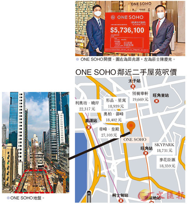 現時鄰近ONE SOHO的二手屋苑成交呎價約18,359至23,182元。中原亞太區副主席兼住宅部總裁陳永傑表示,ONE SOHO位處九龍核心,首推價單開價可以「震撼價」形容,與鄰近同系帝峰.皇殿比較約有15%折讓,鄰近新入伙單幢物業樓價約有5%折讓。項目位處九龍市中心,鄰近旺角港鐵站,料落成後呎租可達70元,租金回報可達3厘或以上。