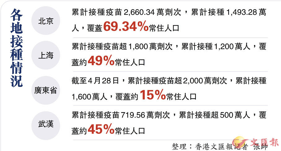 香港文匯報訊(記者 張帥 北京報道)據北京幫楨e消息,截至5月9日,北京市累計報告接種新冠病毒疫苗2,660.34萬劑次,累計接種1,493.28萬人。