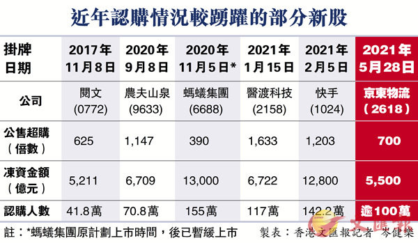 香港文匯報訊(記者 岑健樂)京東物流(2618)備受市場熱烈歡迎,該股前日截孖展,昨日截止公開認購。消息指,京東物流錄得逾100萬人認購,超購逾700倍,凍資逾5,500億元。該股若成功落實於下周五掛牌上市,將成為繼京東(9618)及京東健康(6618)後,京東系內第三隻港股,而且它們的上市時間距離不足一年。