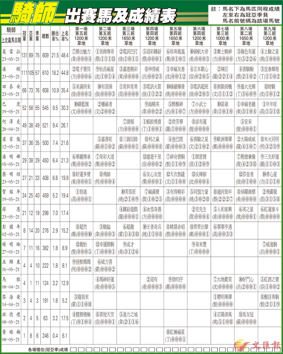 騎師出賽馬及成績表