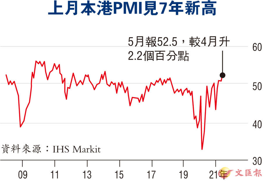 本港營商環境進一步好轉,IHS Markit昨公布,香港5月採購經理指數(PMI)報52.5,創2014年2月以來新高,較4月時50.3上升2.2,顯示營商環境連續第四個月好轉。本港防疫措施在4月底進一步放寬,明顯對香港私營經濟在5月份表現有正面效應,雖仍有個別企業持續受新冠肺炎疫情影響,但產出量增長率亦見2018年2月以來最快。有廠商亦表示,明顯感受到消費者「手鬆驉v,相信疫情影響已到了尾聲,今年會繼續加大投資。●香港文匯報記者 莊程敏
